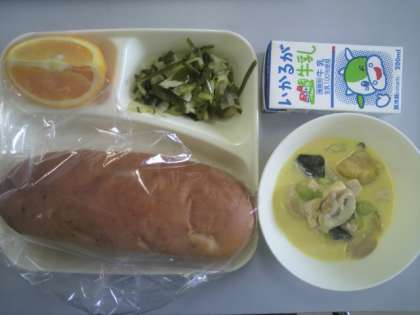 6月2日(金)給食の献立は、かぼちゃのクリームシチュー・ミックス海そうのサラダ・オレンジ・パン・牛乳でした。