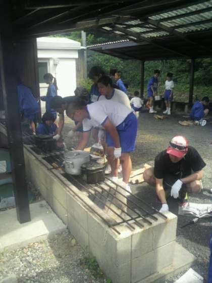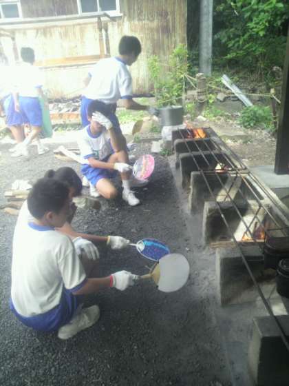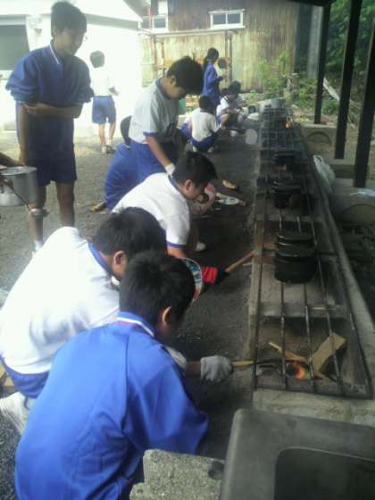 米とぎも終わり、飯盒をのせ、煙とたたかいながら、みんな頑張っています。