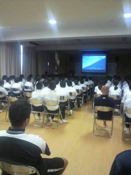 1年生は、区役所の方から「大規模地震への備え」についてパワーポイントで説明をうけました。また、学年ごとに分かれる前に、全校避難訓練を行いました。