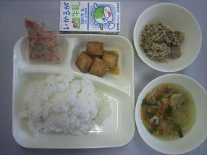 7月5日(水)給食の献立は、ゴーヤチャンプルー・五目汁・あつあげのしょうがじょうゆかけ・米飯・牛乳でした。
