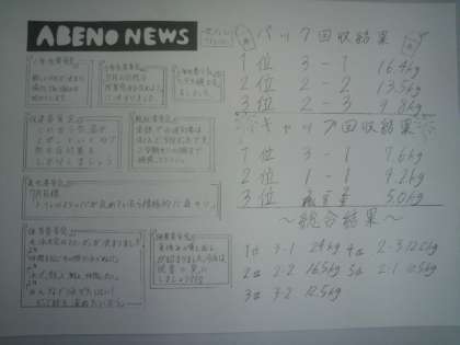 7月10日(月)全校集会で、生徒会より、エコキャップ・紙パック表彰がありました。今回は、第1位が3年1組(24kg)、第2位が2年2組(16.5kg)、第3位が3年2組(12.5kg)でした。この結果は、校内発行紙『ABENO NEWS』でも紹介されました。