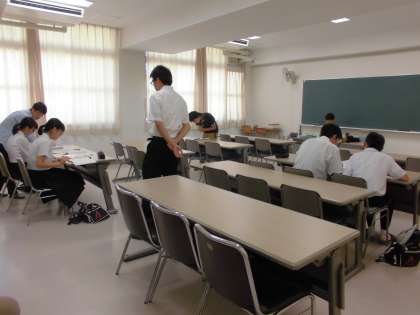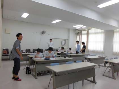 いよいよ明日から2学期が始まります。学校元気アップ地域本部では、毎年、夏休み最後の2日間、3年自主学習会を行っています。学習サポーターとして、大学生に今年も6名参加していただいています。会議室で午前11時まで開催しています。宿題のわからないところや勉強で教えてもらいたいところがある3年生待ってます!!