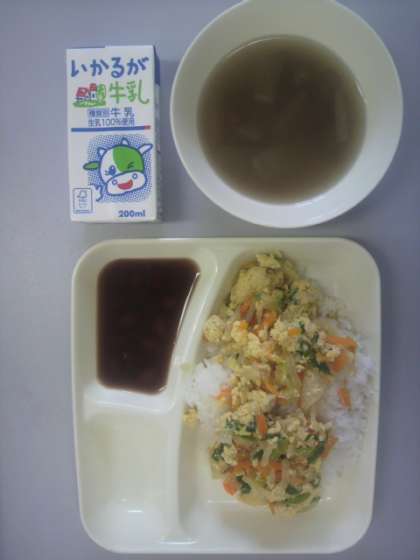 9月14日(木)給食の献立は、親子丼(卵)・とうがんのすまし汁・金時豆の煮もの・牛乳でした。