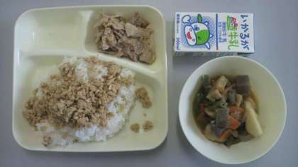 10月13日(金)給食の献立は、豚肉のねぎだれかけ・ふきよせ煮・ツナ大豆そぼろ・米飯・牛乳でした。
