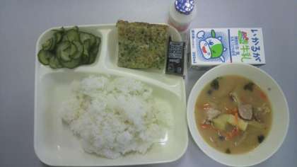 10月16日(月)給食の献立は、お好み焼き・豚汁・きゅうりの梅風味・はっ酵乳・米飯・牛乳でした。