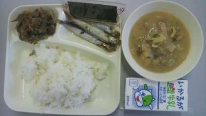 11月6日(月)給食の献立は、焼きししゃも・みそ汁・きんぴらごぼう・焼きのり・米飯・牛乳でした。