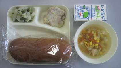 11月9日(木)給食の献立は、かつおのガーリックマヨネーズ焼き・スープ・キャベツと三度豆のサラダ・パン・牛乳でした。