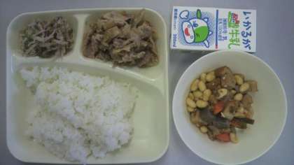 11月10日(金)給食の献立は、豚肉のごまだれ焼き・大豆の煮物・切り干しだいこんのしそ甘酢づけ・米飯・牛乳でした。