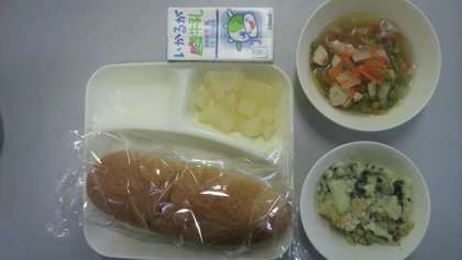 1月11日(木)給食の献立は、ほたて貝のグラタン・スープ・和なし(カット缶)・パン・牛乳でした。