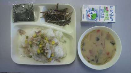 1月12日(金)給食の献立は、れんこんのちらしずし、ぞう煮、ごまめ、牛乳でした。