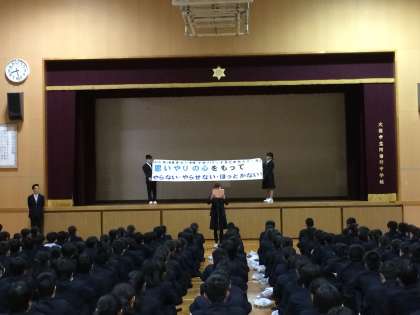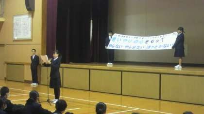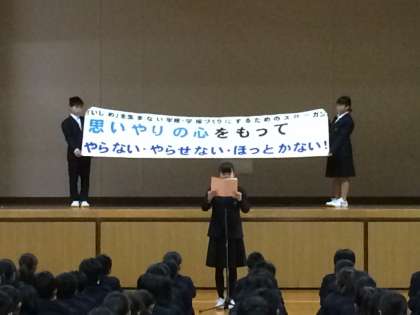 みなさん、先日のいじめについてのアンケートへのご協力ありがとうございました。集計した結果、いじめはいけないこと、やってはいけないことという意見が大半でした。しかし、いじめはなくなると思うかという質問に関しては意見が半分に割れました。その理由は、大半の人がいじめはダメと思っているのにいじめがなくならないのは、自分にはそんなつもりではなくても相手が嫌な思いをすれば、それはいじめになってしまうからだということでした。私は考えました。強盗をするかというと、私たちは絶対に犯さないと思います。絶対的に悪いことだと思っているからです。人に思いやりを持たなかったり、人が嫌がることをすることは、絶対にしてはいけないことだと自覚したらなくなると考えました。第一にいじめは人権侵害であり、人として決して許される行為ではありません。第二にいじめは大人の気づきにくいところで行われることが多く発見しにくいですが、一番身近にいる私たちが必ず気づきやすいです。いじめを見て、見ぬふりをすることは絶対的に悪いことです。第三にいじめはいじめられる側にも問題があるという見方はまちがっています。いじめることが絶対悪いと認めることが大切です。いじめがなくならないと考えるのは、意志の弱さではないかと思いました。そこで、みんなで決意したいと思います。私たちが今からやれることは相手が嫌な思いをすることや不快に思うことは絶対にしたり、言ったりせず、思いやりの心を持つということから始めていくことです。それを持たないことは人として絶対に悪いことだと日頃から自覚し続け大事にしていくことです。そして、いじめをなくすためのスローガンが決まりました。それは、『思いやりの心をもって、やらない、やらせない、ほっとかない!』です。このスローガンによって、阿倍野中学校の全生徒が共通の意識をもって、これからもいじめをしない、させない「いじめゼロ」の学校にして、みんなが安心して登校できるように心がけることをここに宣言します。 2018年1月15日 阿倍野中学校 生徒会会長 中武優希