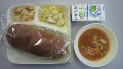 1月15日(月)給食の献立は、鶏肉と野菜のケチャップ煮、カリフラワーとコーンのサラダ、桃のクラフティ、パン、牛乳でした。