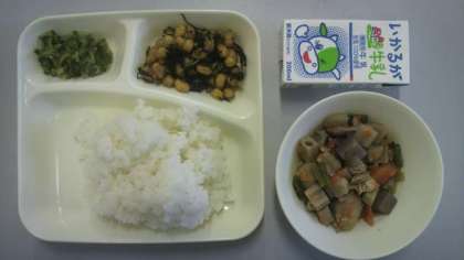 1月16日(火)給食の献立は、筑前煮・ひじき豆・きゅうりのかつお梅風味・米飯・牛乳でした。