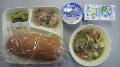 1月17日(水)給食の献立は、豚肉のオイスターソース焼き・糸寒天のスープ・ピリ辛あえ・ヨーグルト・パン・牛乳でした。
