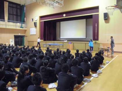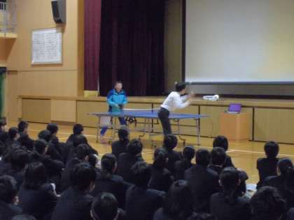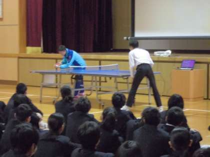 1月20日(土)夢授業がありました。今回は、卓球で、2004年アテネオリンピック出場(シングルス・ダブルス日本代表)の新井周(あらいしゅう)さんをお招きし、3年生の卓球部員とラリーをしてもらったあと、講演していただきました。