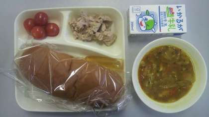 1月24日(水)給食の献立は、豚肉のしょうゆマヨネーズ焼き・カレースープ・プチトマト・パン・牛乳でした。