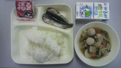 2月1日(木)給食の献立は、いわしのしょうがじょうゆかけ・含め煮・いり大豆・米飯・牛乳でした。今日は、節分の行事献立でした。