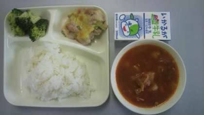2月21日(水)給食の献立は、鶏肉とチーズのカラフル焼き・野菜のミネストローネ・ブロッコリーのサラダ・米飯・牛乳でした。