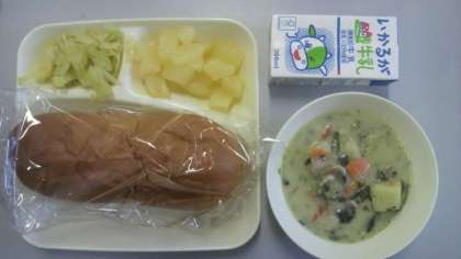 2月27日(火)給食の献立は、ほうれん草のクリームシチュー・キャベツのサラダ・洋なし(カット缶)・パン・牛乳でした。