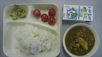 3月1日(木)給食の献立は、チキンカレーライス・キャベツときゅうりのサラダ・プチトマト・牛乳でした。
