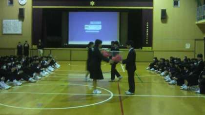 3月5日(月)1限目に、生徒会が進行役をつとめ「3年生を送る会」がありました。在校生代表の言葉と卒業生代表の言葉のあと、3年間の思い出ビデオの上映がありました。そして、3年各クラスごとに卒業式につける胸かざりが透明のケースに入れて贈られました。