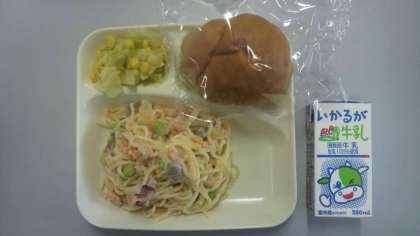3月8日(木)給食の献立は、さけのクリームスパゲッティ・キャベツとコーンのサラダ・パン・牛乳でした。