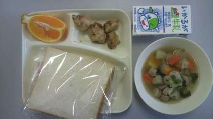 3月12日(月)給食の献立は、鶏肉のみそマヨネーズ焼き・ウインナーのスープ煮・デコポン・パン・牛乳でした。