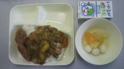 4月10日(火)給食の献立は、カツカレーライス・フルーツ白玉・牛乳でした。今日は新入生の入学をお祝いする特別な献立でした。本校の給食は、阿倍野小学校で作られたおかず(副食)が毎日、届けられています。また、みなさんが牛乳を取りに行ったり、食器を返しに行くお部屋には、配膳員(はいぜんいん)さんがおられます。「○年○組の牛乳を取りにきました。」「ごちそうさまでした」等、しっかり言えるようにしましょうね。