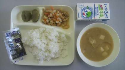 5月15日(火)給食の献立は、かやくご飯・みそ汁・まっ茶ういろう・牛乳でした。