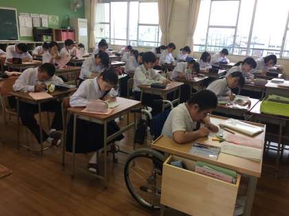 1年生では健康観察後、各クラスにて一泊移住のまとめをしました。