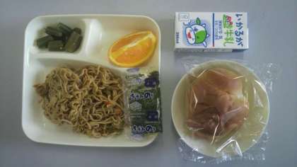 6月14日(木)給食の献立は、焼きそば・オクラの中華あえ・オレンジ・パン・牛乳でした。