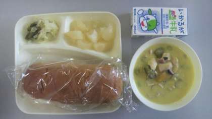 6月20日(水)給食の献立は、かぼちゃのクリームシチュー・キャベツと三度豆のサラダ・和なし(缶)・パン・牛乳でした。