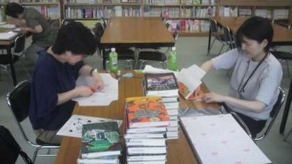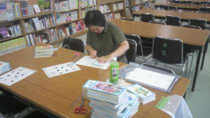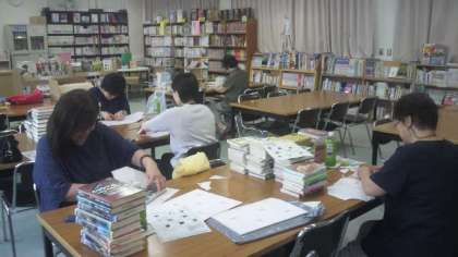 7月25日(水)阿倍野中学校元気アップ地域本部図書ボランティアのみなさんが、朝の9時から12時まで、蔵書の維持管理のため、1冊ずつ手作業でブックコートフィルム貼り付け作業を行っていただきました。明日26日(木)も9時から12時まで図書室で行っていますので、申込み書は事前に出していないけど、時間が空いたのでお手伝いしたい方大歓迎です。少しの時間(1時間だけ)でもOKです。