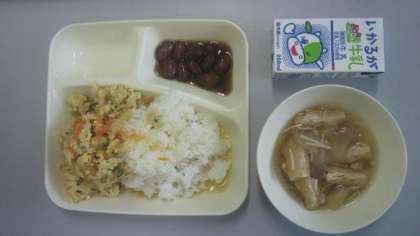 9月7日(金)給食の献立は、親子丼(卵)・とうがんのすまし汁・金時豆の煮もの・米飯・牛乳でした。