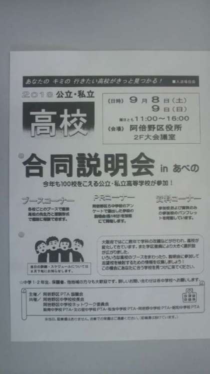 明日9月8日(土)明後日9月9日(日)今年も100校をこえる公立・私立高等学校が、ブースコーナー(直接高校の先生方と面談形式で個別に相談できます)に参加されます。両日とも11:00〜16:00までです。阿倍野区役所2階大会議室でひらかれます。入退場自由です。中学1・2年生、保護者の方々も大歓迎です。※主催/阿倍野区PTA協議会