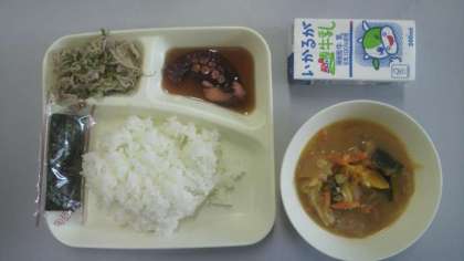 9月10日(月)給食の献立は、たこのやわらか煮・みそ汁・野菜いため・焼きのり・米飯・牛乳でした。