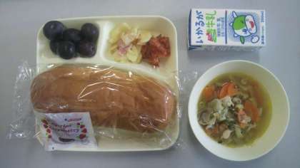 9月14日(金)給食の献立は、鶏肉とてぼ豆のスープ煮・じゃがいもとトマトのチーズ焼き・ぶどう(巨峰)・パン・牛乳でした。