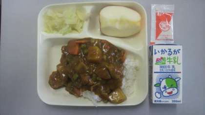 10月4日(木)給食の献立は、ポークカレーライス〔米粉〕・キャベツのサラダ〔ノンエッグドレッシング〕・りんご・牛乳でした。