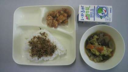 10月17日(水)給食の献立は、鶏肉のたつたあげ・あつあげと野菜の煮もの・おかかなっ葉・米飯・牛乳でした。
