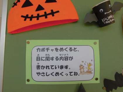 10月31日のアメリカの祝い、ハロウィーンに関する掲示物が貼られていました。よく見ると、目に関する情報がかかれていました。ぜひ読んでみてください。