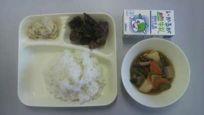 11月5日(月)給食の献立は、くじらのたつたあげ・さといもと野菜の煮もの・もやしのゆずの香あえ・米飯・牛乳でした。