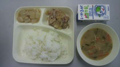 12月3日(月)給食の献立は、豚肉のしょうが焼き・みそ汁・だいこんの煮もの・米飯・牛乳でした。