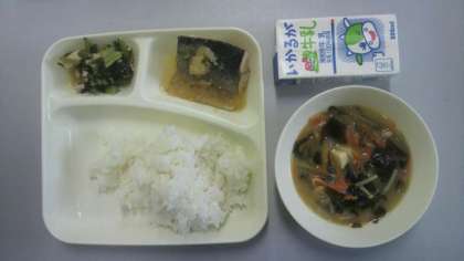 12月10日(月)給食の献立は、さばのみぞれかけ・みそ汁・こまつなの煮びたし・米飯・牛乳でした。
