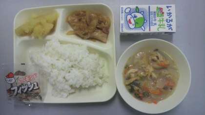 1月15日(火)給食の献立は、鶏肉の甘辛焼き・かす汁・くりきんとん・アーモンドフィッシュ・米飯・牛乳でした。
