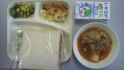 1月16日(水)給食の献立は、豚肉と野菜のケチャップ煮・きゅうりとコーンのサラダ・桃のクラフティ・パン・牛乳でした。