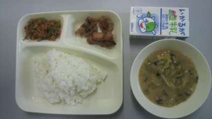 3月1日(金)給食の献立は、鶏肉のてり焼き・さつまいものみそ汁・きんぴらごぼう・米飯・牛乳でした。