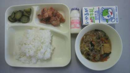 3月5日(火)給食の献立は、鶏肉のチリソース焼き・中華煮・きゅうりの中華あえ・はっ酵乳・米飯・牛乳でした。
