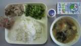 3月16日(金)給食の献立は、豚肉と野菜のいためもの・すまし汁・きな粉よもぎだ...