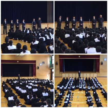 平成31年度 1学期の始業式が体育館で行われました。それに先立ち、登校してきた生徒に対してクラス発表がありました。その後、体育館で集合整列しました。まずはじめに、着任式。本年度教頭先生をはじめ転勤されてきた先生方の紹介をしました。その後、校長先生から始業式にあたり、前向きな気持ちで学校生活を過ごしてほしいというお話がありました。