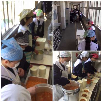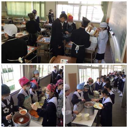 給食の配膳はみんなで協力をして行います。中学校で初めての給食を手際よく配膳できましたか?